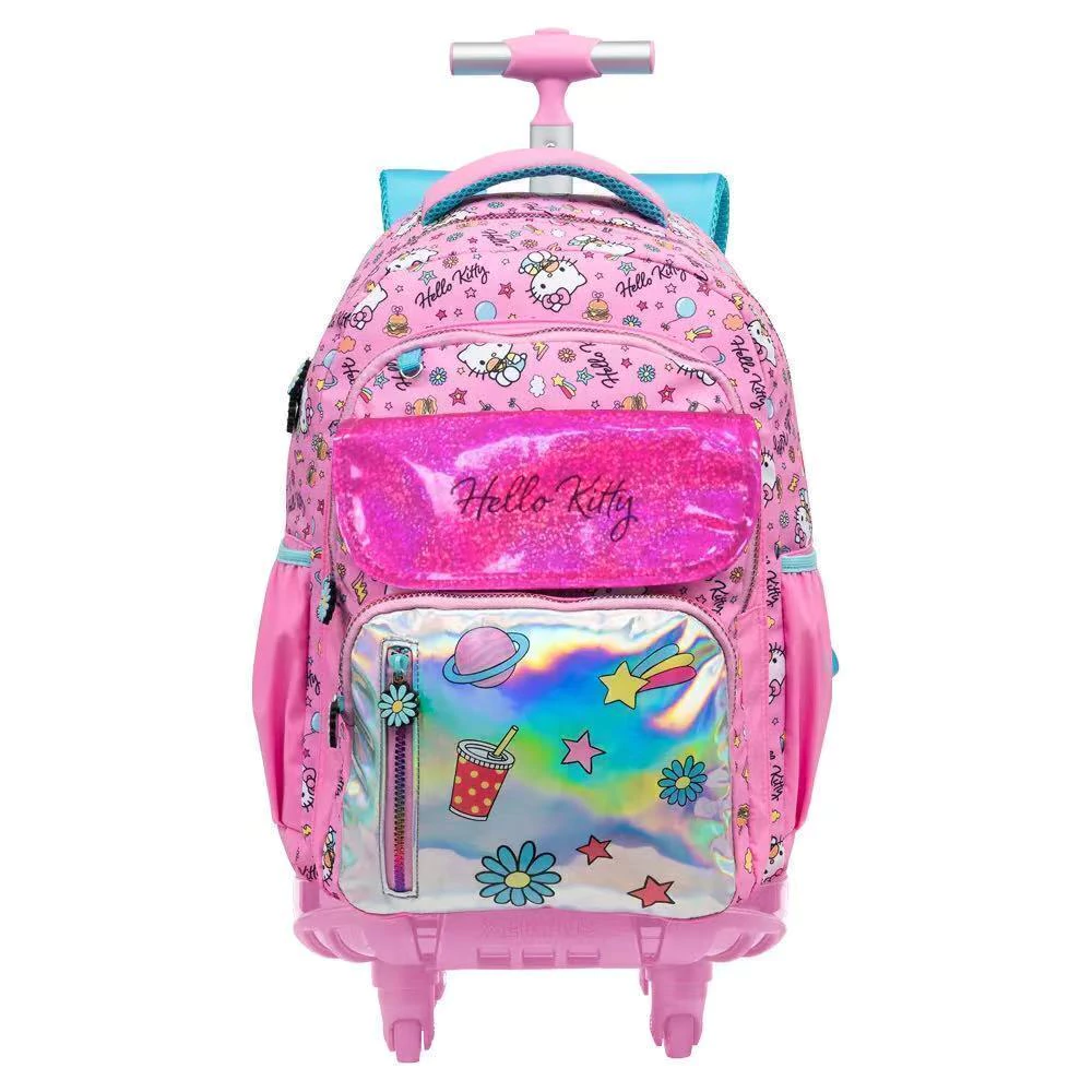 Adquira o KIT Mochila de Rodinhas com Alças Haste T 4 Rodas Tween 43cm Hello Kitty Metalizado com Patches e faça sucesso por onde passar!